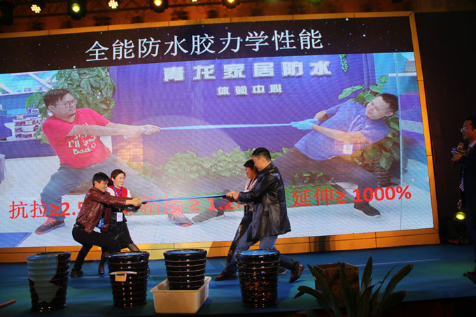 ▲新品發(fā)布會上,青龍防水薛興勇博士發(fā)布了青龍公司全能防水膠、粘彈防水密封膠、家居防水專用卷材、砼1號、砼2號五款新產(chǎn)品,并現(xiàn)場邀請觀眾進(jìn)行產(chǎn)品性能試驗(yàn)。