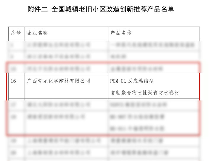 近日,由中國建筑節(jié)能協(xié)會綠色社區(qū)專業(yè)委員會主辦,全國城鎮(zhèn)老舊小區(qū)改造創(chuàng)新推薦產(chǎn)品、技術(shù)申報(bào)企業(yè)材料評審會圓滿結(jié)束,在公開、公平、公正的原則下,青龍公司自主研發(fā)生產(chǎn)的PCM-CL反應(yīng)粘結(jié)型自粘聚合物改性瀝青防水卷材成功入選全國城鎮(zhèn)老舊小區(qū)改造創(chuàng)新產(chǎn)品推薦名單。