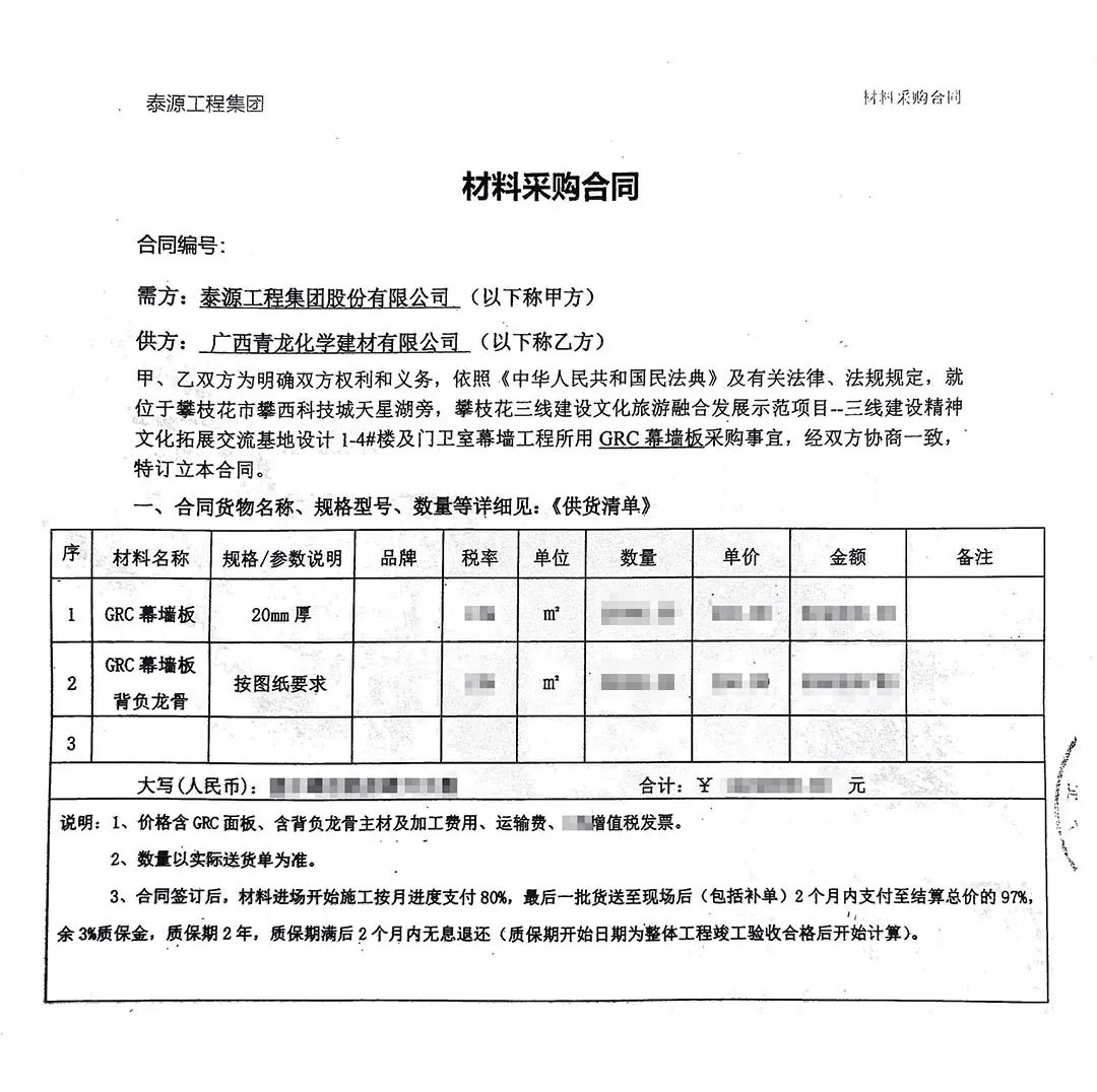 青龍公司此次中標標的為:攀枝花市三線建設精神文化拓展交流基地設計 1-4#樓及門衛(wèi)室幕墻工程所用GRC幕墻板。