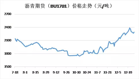 7月份之后,瀝青期貨價(jià)格一路下跌,至10月走穩(wěn)。11月上旬,受?chē)?guó)際原油價(jià)格波動(dòng)影響,瀝青期貨價(jià)格開(kāi)始穩(wěn)步上升,從1830元/噸上漲至12月中旬的2386元/噸,漲幅達(dá)到30%。